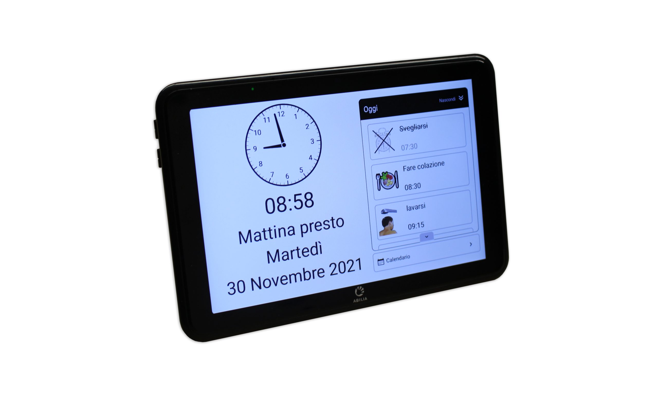 • Visualizzazione della data e dell'ora, con indicazione del momento della giornata (mattina, giorno, sera, notte). I familiari o gli operatori sanitari possono aiutare a mantenere aggiornato il calendario da remoto anche  tramite l’app gratuita myAbilia.